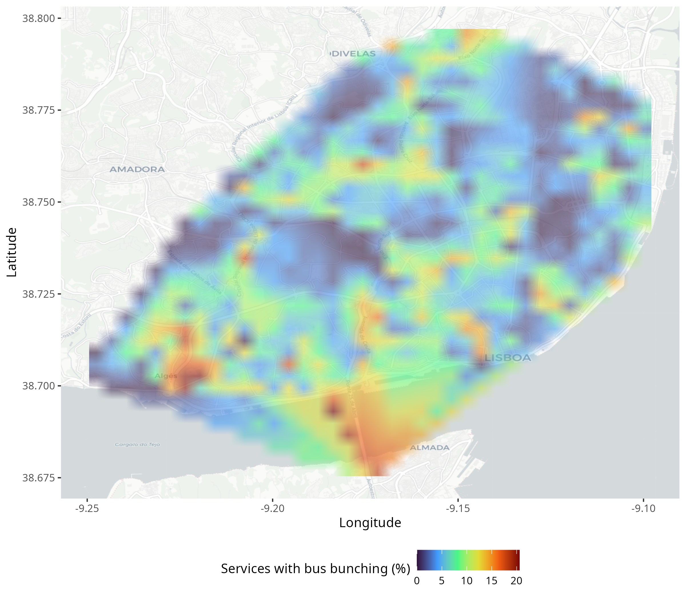 On stops served by bus lanes (14.6%), 8.38% of the services are bunched